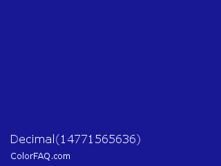 Decimal 14771565636 Color is a normal blue color and the nearest color is Jacksons Purple #20208d. Hex code #191894 and RGB value is rgb(25,24,148). In RGB color space, this color is composed of 10% red, 9% green, 58% blue, In CMYK color space, this color is composed of 83% cyan, 84% magenta, 0% yellow , 42% black , In HSL color space, this color has a hue angle of 240° , 72% saturation and 34% lightness.