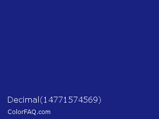 Decimal 14771574569 Color is a dark blue color and the nearest color is Jacksons Purple #20208d. Hex code #192181 and RGB value is rgb(25,33,129). In RGB color space, this color is composed of 10% red, 13% green, 51% blue, In CMYK color space, this color is composed of 81% cyan, 74% magenta, 0% yellow , 49% black , In HSL color space, this color has a hue angle of 235° , 68% saturation and 30% lightness.