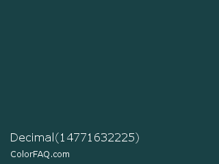 Decimal 14771632225 Color is a very dark cyan color and the nearest color is Te Papa Green #1e433c. Hex code #194145 and RGB value is rgb(25,65,69). In RGB color space, this color is composed of 10% red, 25% green, 27% blue, In CMYK color space, this color is composed of 64% cyan, 6% magenta, 0% yellow , 73% black , In HSL color space, this color has a hue angle of 185° , 47% saturation and 18% lightness.