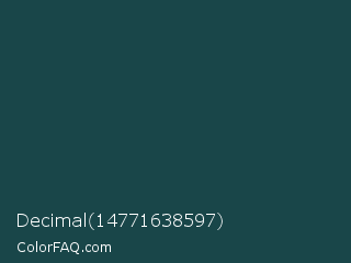 Decimal 14771638597 Color is a very dark cyan color and the nearest color is Blue Dianne #204852. Hex code #194649 and RGB value is rgb(25,70,73). In RGB color space, this color is composed of 10% red, 27% green, 29% blue, In CMYK color space, this color is composed of 66% cyan, 4% magenta, 0% yellow , 71% black , In HSL color space, this color has a hue angle of 184° , 49% saturation and 19% lightness.