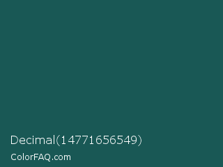 Decimal 14771656549 Color is a very dark cyan color and the nearest color is Eden #105852. Hex code #195855 and RGB value is rgb(25,88,85). In RGB color space, this color is composed of 10% red, 35% green, 33% blue, In CMYK color space, this color is composed of 72% cyan, 0% magenta, 3% yellow , 65% black , In HSL color space, this color has a hue angle of 177° , 56% saturation and 22% lightness.