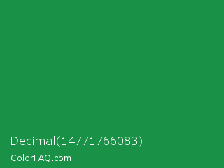 Decimal 14771766083 Color is a normal green color and the nearest color is Salem #097f4b. Hex code #199147 and RGB value is rgb(25,145,71). In RGB color space, this color is composed of 10% red, 57% green, 28% blue, In CMYK color space, this color is composed of 83% cyan, 0% magenta, 51% yellow , 43% black , In HSL color space, this color has a hue angle of 143° , 71% saturation and 33% lightness.