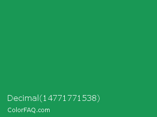 Decimal 14771771538 Color is a normal green color and the nearest color is Eucalyptus #278a5b. Hex code #199754 and RGB value is rgb(25,151,84). In RGB color space, this color is composed of 10% red, 59% green, 33% blue, In CMYK color space, this color is composed of 83% cyan, 0% magenta, 44% yellow , 41% black , In HSL color space, this color has a hue angle of 148° , 72% saturation and 35% lightness.
