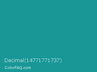 Decimal 14771771737 Color is a normal cyan color and the nearest color is Blue Chill #0c8990. Hex code #199797 and RGB value is rgb(25,151,151). In RGB color space, this color is composed of 10% red, 59% green, 59% blue, In CMYK color space, this color is composed of 83% cyan, 0% magenta, 0% yellow , 41% black , In HSL color space, this color has a hue angle of 180° , 72% saturation and 35% lightness.