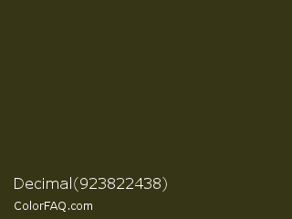 Decimal 923822438 Color is a very dark yellow color and the nearest color is Pullman Green #3b331c. Hex code #363516 and RGB value is rgb(54,53,22). In RGB color space, this color is composed of 21% red, 21% green, 9% blue, In CMYK color space, this color is composed of 0% cyan, 2% magenta, 59% yellow , 79% black , In HSL color space, this color has a hue angle of 58° , 42% saturation and 15% lightness.