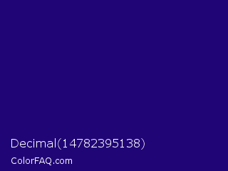 Decimal 14782395138 Color is a dark indigo color and the nearest color is Deep Blue #220878. Hex code #200576 and RGB value is rgb(32,5,118). In RGB color space, this color is composed of 13% red, 2% green, 46% blue, In CMYK color space, this color is composed of 73% cyan, 96% magenta, 0% yellow , 54% black , In HSL color space, this color has a hue angle of 254° , 92% saturation and 24% lightness.