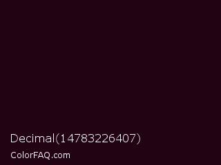 Decimal 14783226407 Color is a almost black rose color and the nearest color is Night Rider #1f120f. Hex code #210313 and RGB value is rgb(33,3,19). In RGB color space, this color is composed of 13% red, 1% green, 7% blue, In CMYK color space, this color is composed of 0% cyan, 91% magenta, 42% yellow , 87% black , In HSL color space, this color has a hue angle of 328° , 83% saturation and 7% lightness.