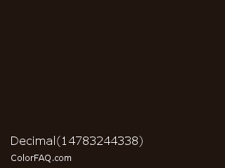 Decimal 14783244338 Color is a very dark orange color and the nearest color is Night Rider #1f120f. Hex code #211510 and RGB value is rgb(33,21,16). In RGB color space, this color is composed of 13% red, 8% green, 6% blue, In CMYK color space, this color is composed of 0% cyan, 36% magenta, 52% yellow , 87% black , In HSL color space, this color has a hue angle of 18° , 35% saturation and 10% lightness.
