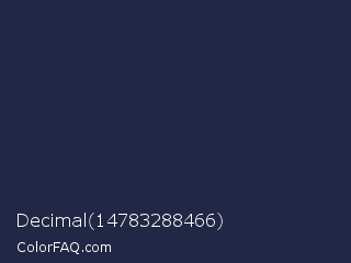 Decimal 14783288466 Color is a very dark blue color and the nearest color is Yankees Blue #1c2841. Hex code #212744 and RGB value is rgb(33,39,68). In RGB color space, this color is composed of 13% red, 15% green, 27% blue, In CMYK color space, this color is composed of 51% cyan, 43% magenta, 0% yellow , 73% black , In HSL color space, this color has a hue angle of 230° , 35% saturation and 20% lightness.