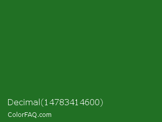 Decimal 14783414600 Color is a dark green color and the nearest color is Mughal Green #306030. Hex code #217024 and RGB value is rgb(33,112,36). In RGB color space, this color is composed of 13% red, 44% green, 14% blue, In CMYK color space, this color is composed of 71% cyan, 0% magenta, 68% yellow , 56% black , In HSL color space, this color has a hue angle of 122° , 54% saturation and 28% lightness.