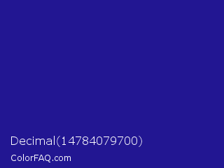 Decimal 14784079700 Color is a normal indigo color and the nearest color is Jacksons Purple #20208d. Hex code #221692 and RGB value is rgb(34,22,146). In RGB color space, this color is composed of 13% red, 9% green, 57% blue, In CMYK color space, this color is composed of 77% cyan, 85% magenta, 0% yellow , 43% black , In HSL color space, this color has a hue angle of 246° , 74% saturation and 33% lightness.