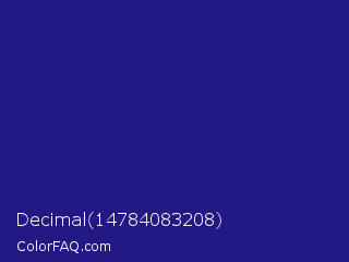 Decimal 14784083208 Color is a normal indigo color and the nearest color is Jacksons Purple #20208d. Hex code #221984 and RGB value is rgb(34,25,132). In RGB color space, this color is composed of 13% red, 10% green, 52% blue, In CMYK color space, this color is composed of 74% cyan, 81% magenta, 0% yellow , 48% black , In HSL color space, this color has a hue angle of 245° , 68% saturation and 31% lightness.