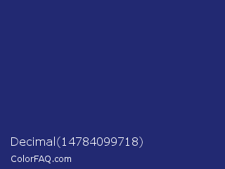 Decimal 14784099718 Color is a dark blue color and the nearest color is St Patricks Blue #23297a. Hex code #222972 and RGB value is rgb(34,41,114). In RGB color space, this color is composed of 13% red, 16% green, 45% blue, In CMYK color space, this color is composed of 70% cyan, 64% magenta, 0% yellow , 55% black , In HSL color space, this color has a hue angle of 235° , 54% saturation and 29% lightness.