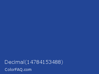Decimal 14784153488 Color is a normal blue color and the nearest color is Sapphire #2f519e. Hex code #224596 and RGB value is rgb(34,69,150). In RGB color space, this color is composed of 13% red, 27% green, 59% blue, In CMYK color space, this color is composed of 77% cyan, 54% magenta, 0% yellow , 41% black , In HSL color space, this color has a hue angle of 222° , 63% saturation and 36% lightness.