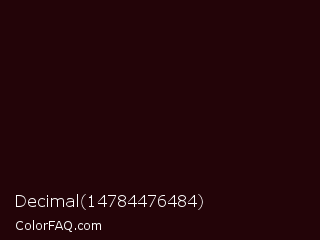 Decimal 14784476484 Color is a almost black red color and the nearest color is Kilamanjaro #240c02. Hex code #230408 and RGB value is rgb(35,4,8). In RGB color space, this color is composed of 14% red, 2% green, 3% blue, In CMYK color space, this color is composed of 0% cyan, 89% magenta, 77% yellow , 86% black , In HSL color space, this color has a hue angle of 352° , 79% saturation and 8% lightness.