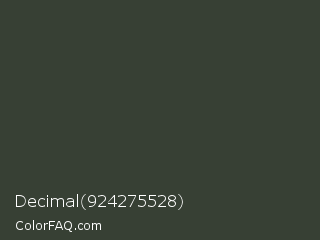 Decimal 924275528 Color is a dark green color and the nearest color is Kombu Green #354230. Hex code #374034 and RGB value is rgb(55,64,52). In RGB color space, this color is composed of 22% red, 25% green, 20% blue, In CMYK color space, this color is composed of 14% cyan, 0% magenta, 19% yellow , 75% black , In HSL color space, this color has a hue angle of 105° , 10% saturation and 23% lightness.