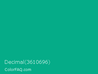 Decimal 3610696 Color is a normal cyan color and the nearest color is Niagara #06a189. Hex code #05ac88 and RGB value is rgb(5,172,136). In RGB color space, this color is composed of 2% red, 67% green, 53% blue, In CMYK color space, this color is composed of 97% cyan, 0% magenta, 21% yellow , 33% black , In HSL color space, this color has a hue angle of 167° , 94% saturation and 35% lightness.