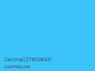 Decimal 57803843 Color is a normal blue color and the nearest color is Picton Blue #45b1e8. Hex code #38c4fb and RGB value is rgb(56,196,251). In RGB color space, this color is composed of 22% red, 77% green, 98% blue, In CMYK color space, this color is composed of 78% cyan, 22% magenta, 0% yellow , 2% black , In HSL color space, this color has a hue angle of 197° , 96% saturation and 60% lightness.