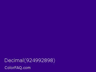 Decimal 924992898 Color is a dark violet color and the nearest color is Kingfisher Daisy #3e0480. Hex code #380086 and RGB value is rgb(56,0,134). In RGB color space, this color is composed of 22% red, 0% green, 53% blue, In CMYK color space, this color is composed of 58% cyan, 100% magenta, 0% yellow , 47% black , In HSL color space, this color has a hue angle of 265° , 100% saturation and 26% lightness.