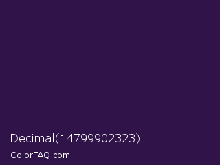 Decimal 14799902323 Color is a very dark purple color and the nearest color is Russian Violet #32174d. Hex code #301449 and RGB value is rgb(48,20,73). In RGB color space, this color is composed of 19% red, 8% green, 29% blue, In CMYK color space, this color is composed of 34% cyan, 73% magenta, 0% yellow , 71% black , In HSL color space, this color has a hue angle of 272° , 57% saturation and 18% lightness.