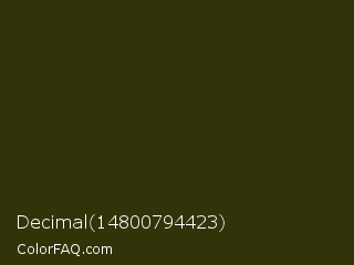 Decimal 14800794423 Color is a very dark yellow color and the nearest color is Turtle Green #2a380b. Hex code #313409 and RGB value is rgb(49,52,9). In RGB color space, this color is composed of 19% red, 20% green, 4% blue, In CMYK color space, this color is composed of 6% cyan, 0% magenta, 83% yellow , 80% black , In HSL color space, this color has a hue angle of 64° , 70% saturation and 12% lightness.
