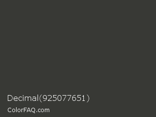 Decimal 925077651 Color is a very dark lime color and the nearest color is Black Olive #3b3c36. Hex code #383935 and RGB value is rgb(56,57,53). In RGB color space, this color is composed of 22% red, 22% green, 21% blue, In CMYK color space, this color is composed of 2% cyan, 0% magenta, 7% yellow , 78% black , In HSL color space, this color has a hue angle of 75° , 4% saturation and 22% lightness.