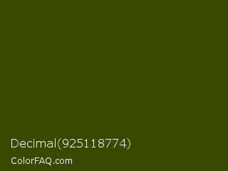Decimal 925118774 Color is a very dark lime color and the nearest color is Clover #384910. Hex code #384900 and RGB value is rgb(56,73,0). In RGB color space, this color is composed of 22% red, 29% green, 0% blue, In CMYK color space, this color is composed of 23% cyan, 0% magenta, 100% yellow , 71% black , In HSL color space, this color has a hue angle of 74° , 100% saturation and 14% lightness.