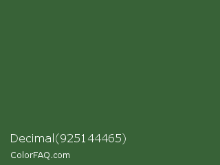 Decimal 925144465 Color is a dark green color and the nearest color is Hunter Green #355e3b. Hex code #386237 and RGB value is rgb(56,98,55). In RGB color space, this color is composed of 22% red, 38% green, 22% blue, In CMYK color space, this color is composed of 43% cyan, 0% magenta, 44% yellow , 62% black , In HSL color space, this color has a hue angle of 119° , 28% saturation and 30% lightness.