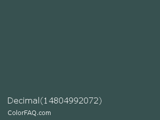Decimal 14804992072 Color is a dark cyan color and the nearest color is Dark Slate Gray #2f4f4f. Hex code #375150 and RGB value is rgb(55,81,80). In RGB color space, this color is composed of 22% red, 32% green, 31% blue, In CMYK color space, this color is composed of 32% cyan, 0% magenta, 1% yellow , 68% black , In HSL color space, this color has a hue angle of 178° , 19% saturation and 27% lightness.