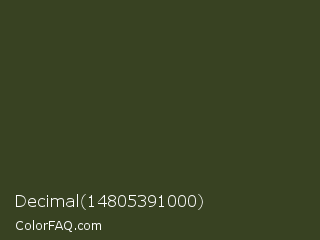 Decimal 14805391000 Color is a very dark lime color and the nearest color is Thatch Green #403d19. Hex code #384222 and RGB value is rgb(56,66,34). In RGB color space, this color is composed of 22% red, 26% green, 13% blue, In CMYK color space, this color is composed of 15% cyan, 0% magenta, 48% yellow , 74% black , In HSL color space, this color has a hue angle of 79° , 32% saturation and 20% lightness.