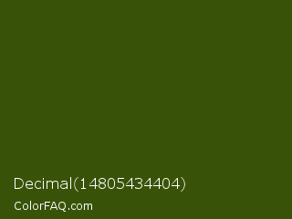 Decimal 14805434404 Color is a very dark green color and the nearest color is Clover #384910. Hex code #385308 and RGB value is rgb(56,83,8). In RGB color space, this color is composed of 22% red, 33% green, 3% blue, In CMYK color space, this color is composed of 33% cyan, 0% magenta, 90% yellow , 67% black , In HSL color space, this color has a hue angle of 82° , 82% saturation and 18% lightness.