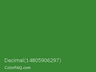 Decimal 14805906297 Color is a normal green color and the nearest color is May Green #4c9141. Hex code #388733 and RGB value is rgb(56,135,51). In RGB color space, this color is composed of 22% red, 53% green, 20% blue, In CMYK color space, this color is composed of 59% cyan, 0% magenta, 62% yellow , 47% black , In HSL color space, this color has a hue angle of 116° , 45% saturation and 36% lightness.