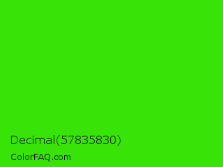 Decimal 57835830 Color is a normal green color and the nearest color is Harlequin #3fff00. Hex code #38e308 and RGB value is rgb(56,227,8). In RGB color space, this color is composed of 22% red, 89% green, 3% blue, In CMYK color space, this color is composed of 75% cyan, 0% magenta, 96% yellow , 11% black , In HSL color space, this color has a hue angle of 107° , 93% saturation and 46% lightness.
