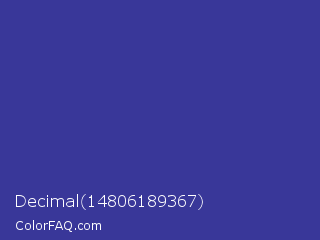 Decimal 14806189367 Color is a normal indigo color and the nearest color is Blue Pigment #333399. Hex code #393799 and RGB value is rgb(57,55,153). In RGB color space, this color is composed of 22% red, 22% green, 60% blue, In CMYK color space, this color is composed of 63% cyan, 64% magenta, 0% yellow , 40% black , In HSL color space, this color has a hue angle of 241° , 47% saturation and 41% lightness.