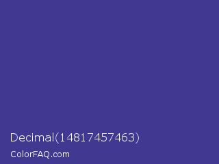 Decimal 14817457463 Color is a normal indigo color and the nearest color is Dark Slate Blue #483d8b. Hex code #403891 and RGB value is rgb(64,56,145). In RGB color space, this color is composed of 25% red, 22% green, 57% blue, In CMYK color space, this color is composed of 56% cyan, 61% magenta, 0% yellow , 43% black , In HSL color space, this color has a hue angle of 245° , 44% saturation and 39% lightness.