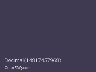 Decimal 14817457968 Color is a dark indigo color and the nearest color is Bright Gray #3c4151. Hex code #403952 and RGB value is rgb(64,57,82). In RGB color space, this color is composed of 25% red, 22% green, 32% blue, In CMYK color space, this color is composed of 22% cyan, 30% magenta, 0% yellow , 68% black , In HSL color space, this color has a hue angle of 257° , 18% saturation and 27% lightness.