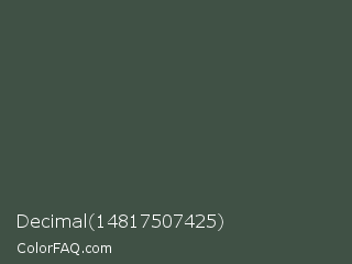 Decimal 14817507425 Color is a dark green color and the nearest color is Outer Space #414a4c. Hex code #405145 and RGB value is rgb(64,81,69). In RGB color space, this color is composed of 25% red, 32% green, 27% blue, In CMYK color space, this color is composed of 21% cyan, 0% magenta, 15% yellow , 68% black , In HSL color space, this color has a hue angle of 138° , 12% saturation and 28% lightness.