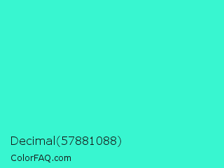 Decimal 57881088 Color is a normal cyan color and the nearest color is Turquoise #40e0d0. Hex code #38f6d0 and RGB value is rgb(56,246,208). In RGB color space, this color is composed of 22% red, 96% green, 82% blue, In CMYK color space, this color is composed of 77% cyan, 0% magenta, 15% yellow , 4% black , In HSL color space, this color has a hue angle of 168° , 91% saturation and 59% lightness.