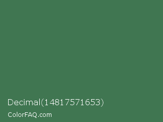 Decimal 14817571653 Color is a normal green color and the nearest color is Goblin #3d7d52. Hex code #407651 and RGB value is rgb(64,118,81). In RGB color space, this color is composed of 25% red, 46% green, 32% blue, In CMYK color space, this color is composed of 46% cyan, 0% magenta, 31% yellow , 54% black , In HSL color space, this color has a hue angle of 139° , 30% saturation and 36% lightness.