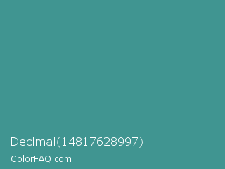Decimal 14817628997 Color is a normal cyan color and the nearest color is Zomp #39a78e. Hex code #409591 and RGB value is rgb(64,149,145). In RGB color space, this color is composed of 25% red, 58% green, 57% blue, In CMYK color space, this color is composed of 57% cyan, 0% magenta, 3% yellow , 42% black , In HSL color space, this color has a hue angle of 177° , 40% saturation and 42% lightness.