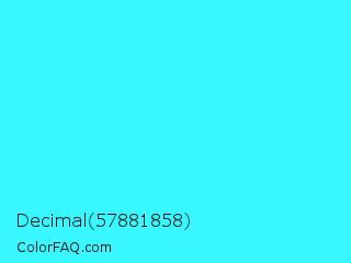Decimal 57881858 Color is a light cyan color and the nearest color is Loeen #15f2fd. Hex code #38f7fe and RGB value is rgb(56,247,254). In RGB color space, this color is composed of 22% red, 97% green, 100% blue, In CMYK color space, this color is composed of 78% cyan, 3% magenta, 0% yellow , 0% black , In HSL color space, this color has a hue angle of 182° , 99% saturation and 61% lightness.