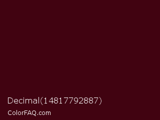 Decimal 14817792887 Color is a very dark red color and the nearest color is Aubergine #3b0910. Hex code #410311 and RGB value is rgb(65,3,17). In RGB color space, this color is composed of 25% red, 1% green, 7% blue, In CMYK color space, this color is composed of 0% cyan, 95% magenta, 74% yellow , 75% black , In HSL color space, this color has a hue angle of 346° , 91% saturation and 13% lightness.