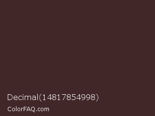 Decimal 14817854998 Color is a very dark red color and the nearest color is Crater Brown #462425. Hex code #412728 and RGB value is rgb(65,39,40). In RGB color space, this color is composed of 25% red, 15% green, 16% blue, In CMYK color space, this color is composed of 0% cyan, 40% magenta, 38% yellow , 75% black , In HSL color space, this color has a hue angle of 358° , 25% saturation and 20% lightness.