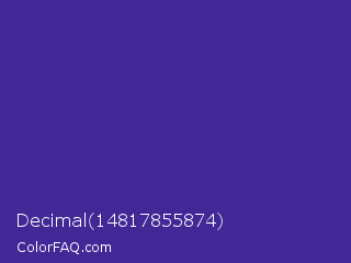 Decimal 14817855874 Color is a normal indigo color and the nearest color is Daisy Bush #4f2398. Hex code #412896 and RGB value is rgb(65,40,150). In RGB color space, this color is composed of 25% red, 16% green, 59% blue, In CMYK color space, this color is composed of 57% cyan, 73% magenta, 0% yellow , 41% black , In HSL color space, this color has a hue angle of 254° , 58% saturation and 37% lightness.