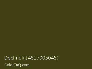 Decimal 14817905045 Color is a very dark yellow color and the nearest color is Thatch Green #403d19. Hex code #414013 and RGB value is rgb(65,64,19). In RGB color space, this color is composed of 25% red, 25% green, 7% blue, In CMYK color space, this color is composed of 0% cyan, 2% magenta, 71% yellow , 75% black , In HSL color space, this color has a hue angle of 59° , 55% saturation and 16% lightness.