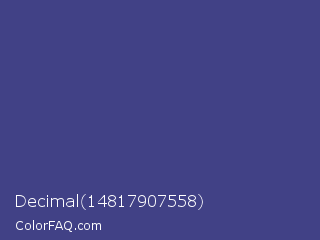 Decimal 14817907558 Color is a normal blue color and the nearest color is Dark Slate Blue #483d8b. Hex code #414186 and RGB value is rgb(65,65,134). In RGB color space, this color is composed of 25% red, 25% green, 53% blue, In CMYK color space, this color is composed of 51% cyan, 51% magenta, 0% yellow , 47% black , In HSL color space, this color has a hue angle of 240° , 35% saturation and 39% lightness.