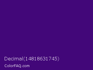 Decimal 14818631745 Color is a dark purple color and the nearest color is Windsor #3c0878. Hex code #420779 and RGB value is rgb(66,7,121). In RGB color space, this color is composed of 26% red, 3% green, 47% blue, In CMYK color space, this color is composed of 45% cyan, 94% magenta, 0% yellow , 53% black , In HSL color space, this color has a hue angle of 271° , 89% saturation and 25% lightness.
