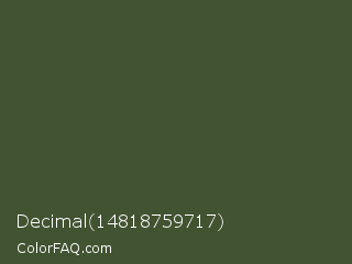 Decimal 14818759717 Color is a dark green color and the nearest color is Rifle Green #444c38. Hex code #425331 and RGB value is rgb(66,83,49). In RGB color space, this color is composed of 26% red, 33% green, 19% blue, In CMYK color space, this color is composed of 20% cyan, 0% magenta, 41% yellow , 67% black , In HSL color space, this color has a hue angle of 90° , 26% saturation and 26% lightness.