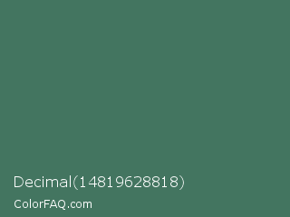 Decimal 14819628818 Color is a normal green color and the nearest color is Amazon #3b7a57. Hex code #437560 and RGB value is rgb(67,117,96). In RGB color space, this color is composed of 26% red, 46% green, 38% blue, In CMYK color space, this color is composed of 43% cyan, 0% magenta, 18% yellow , 54% black , In HSL color space, this color has a hue angle of 155° , 27% saturation and 36% lightness.
