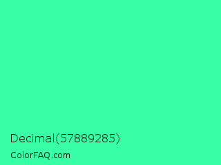 Decimal 57889285 Color is a light green color and the nearest color is Eucalyptus #44d7a8. Hex code #38fea5 and RGB value is rgb(56,254,165). In RGB color space, this color is composed of 22% red, 100% green, 65% blue, In CMYK color space, this color is composed of 78% cyan, 0% magenta, 35% yellow , 0% black , In HSL color space, this color has a hue angle of 153° , 99% saturation and 61% lightness.